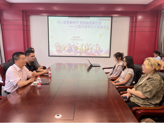 为贯彻落实党中央民族工作会议精神,引导学院师生铸牢中华民族共同体意识,深化民族团结进步教育,促进多民族学生之间的交流,增强他们的爱国爱校情怀,6月13日中午,在德经楼329会议室,经济学院召开“同心筑梦新时代 团结奋进新征程”少数民族学生交流座谈会。经济学院党委书记张圣兵、党委副书记贾亦璞、学生处艾斯克尔·米吉提老师、学工办主任梁少颖、毕业班辅导员张闻老师,来自维吾尔族、哈萨克族、苗族、彝族、壮族、仫佬族、满族、蒙古族等20余名学生参加座谈会。座谈会由梁少颖主持。