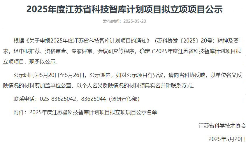 经组织申报、资料预审、专家评审、省科协党组会审议、社会公示等程序,共有南京财经大学、东南大学、南京航空航天大学与南京农业大学金善宝农业现代化发展研究院等15家单位被认定为2025年度江苏省科技创新智库平台基地。科技智库计划(智库)平台项目的申报对象是省级学会(协会、研究会、促进会)、高等院校、科研院所、企业,以及从事科技决策咨询、建言献策工作的相关科研机构。