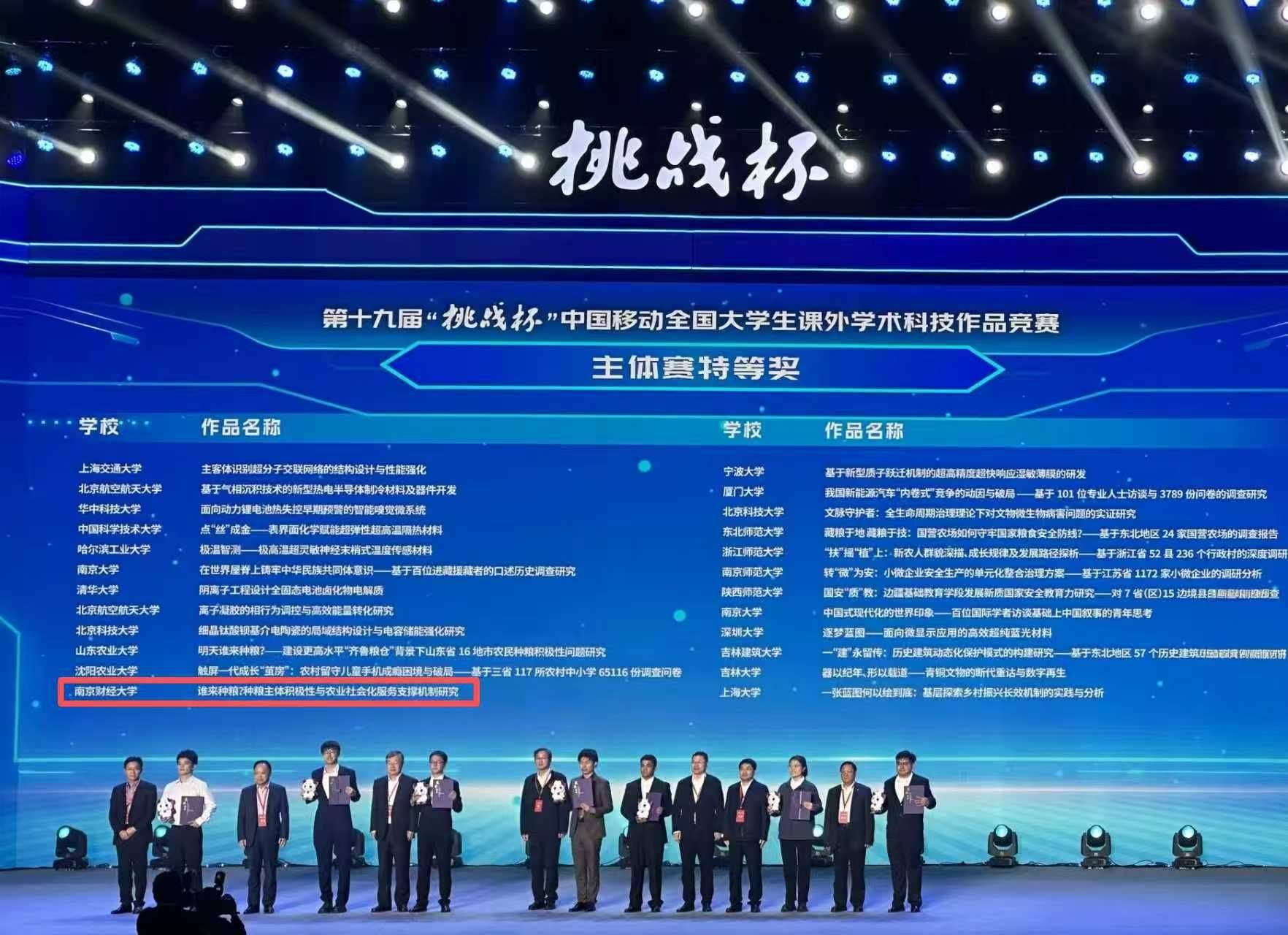 10月31日至11月3日,第十九届“挑战杯”全国大学生课外学术科技作品竞赛在南京大学举行。经网评初审、集中复审、现场答辩,我院参赛作品《谁来种粮?种粮主体积极性与农业社会化服务支撑机制研究》表现优异,脱颖而出,在主体赛中获特等奖1项。这是我院继在第十八届“挑战杯”中获特等奖后,再次在“挑战杯”主体赛中斩获特等奖,也是全国唯一连续两届在主体赛中斩获特等奖的财经院校。