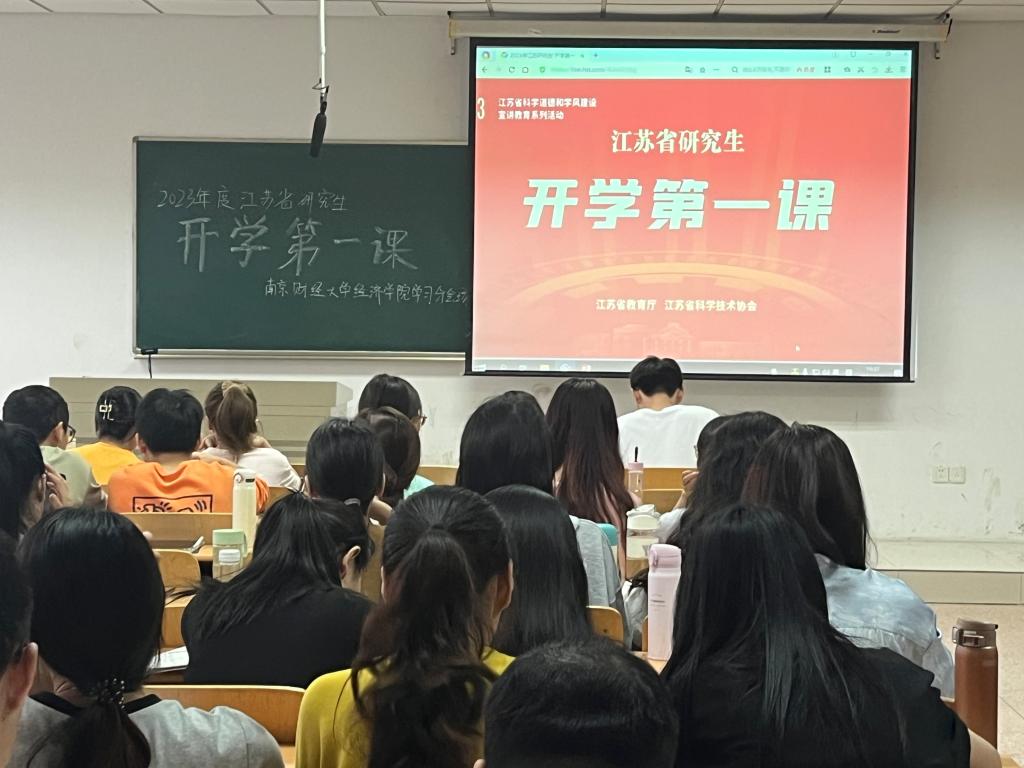 9月26日下午14点30分,经济学院2023级研究生在德经楼210教室共同观看由省教育厅与省科协共同主办的江苏省研究生“开学第一课”,聆听专家院士对“青年担当”的诠释与指导。