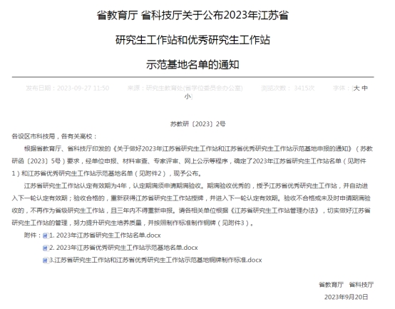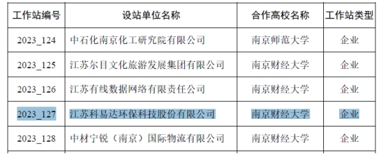 9月27日,江苏省教育厅、科技厅印发《关于公布2023年江苏省研究生工作站和优秀研究生工作站示范基地名单的通知》(苏教研〔2023〕2号),经单位申报、材料审查、专家评审、网上公示等程序,确定了2023年江苏省研究生工作站名单。我院申报的江苏科易达环保科技股份有限公司被批准为2023年江苏省研究生工作站。