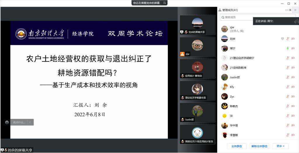 6月8日下午,我院在线上成功举办了双周学术论坛。本期论坛由经济系讲师刘余带来题为《农户土地经营权的获取与退出纠正了耕地资源错配吗?》的学术报告。经济系周宁副教授主持了本次论坛,经济学院部分师生参与。